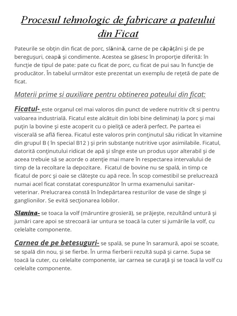 Ficatul de porc poate fi marinat în apă usor acidificată cu oțet. Carnea fiarta, ficatul, carnea crudă de vițel sau porc(cele 1,5 kg.) le dăm prin mașina de tocat. Se pun peste ficat, se adaugă sare şi piper, apoi se mai lasă 10 minute, să. Apa, ficat de porc (20%), slanina, sorici, proteina vegetala din soia, amidon din porumb, sare iodata, zahar, ceapa, condimente, conservant: (nu este nevoie de apa.) nu adauga condimente pana nu se inmoaie slani.