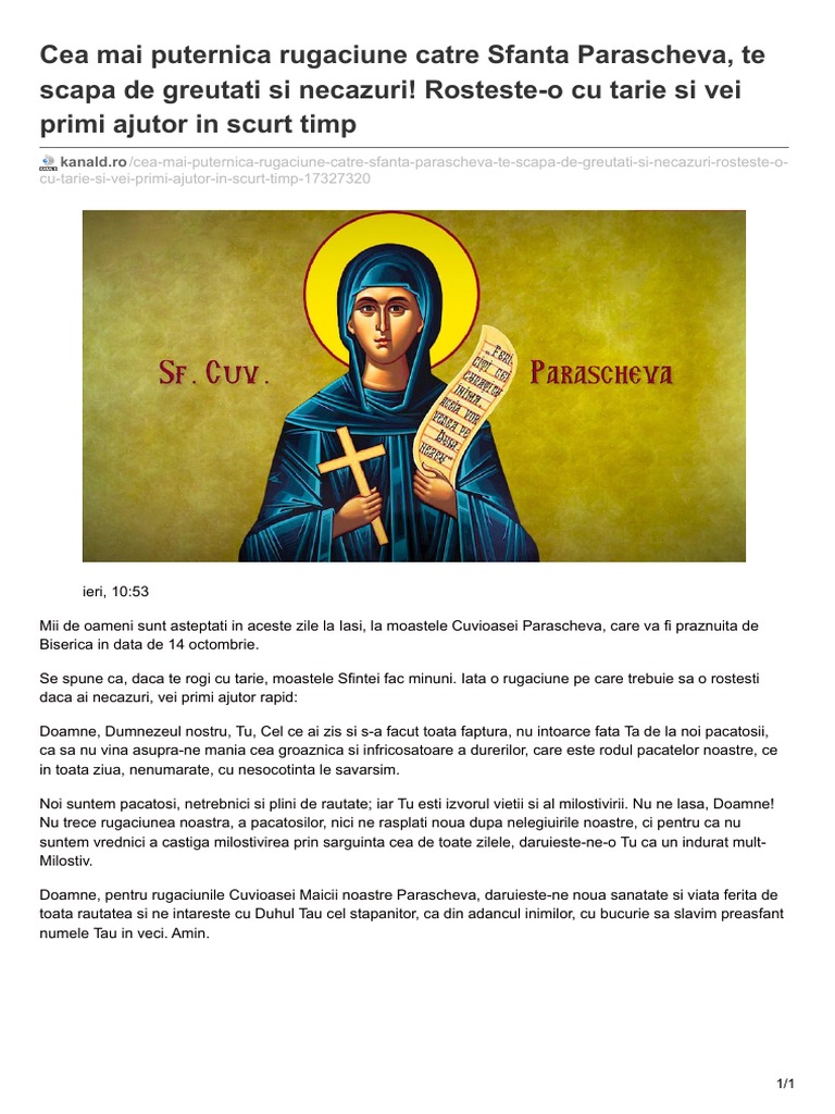 Posted on august 26, 2020. Cea mai puternică rugăciune către sfanta parascheva подробнее. Rugaciunea care se rosteste de sfanta parascheva.