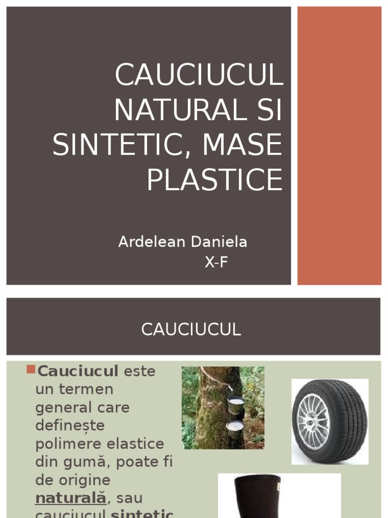 vizitati articolul complet aici : https://es.scribd.com/document/95574496/Cauciucul-Natural-Si-Sintetic In plantele care cresc in deosebi in regiunile tropicale, cauciucul se gaseste fie in niste canale sub forma de suc. Cauciucul poate fi produs în două moduri; Cauciucul natural este folosit atare ca polimer sau sub formă de amestec cu cauciucul sintetic.