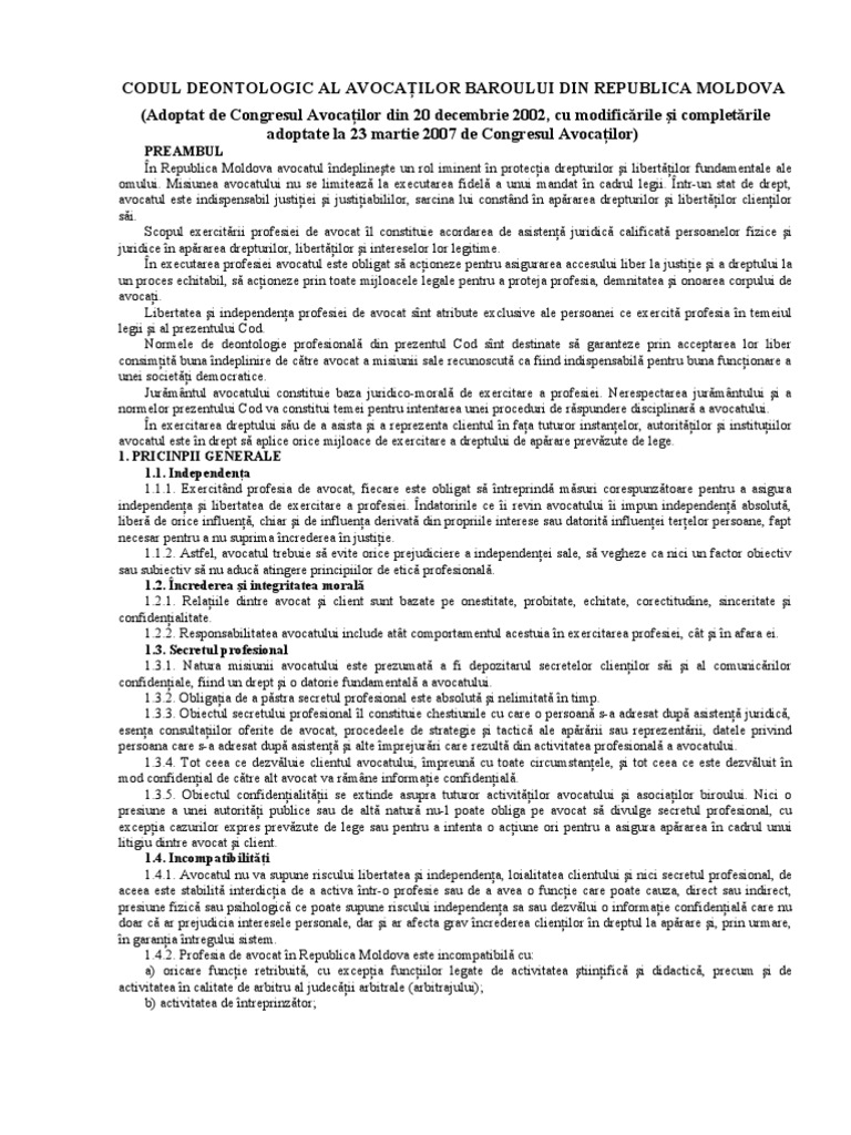 Libertatea şi independenţa profesiei de avocat sînt atribute exclusive ale persoanei ce exercită profesia în temeiul legii şi al prezentului cod. Savesave codul deontologic al avocaţilor baroului din repub. Sortează după cele mai recente.